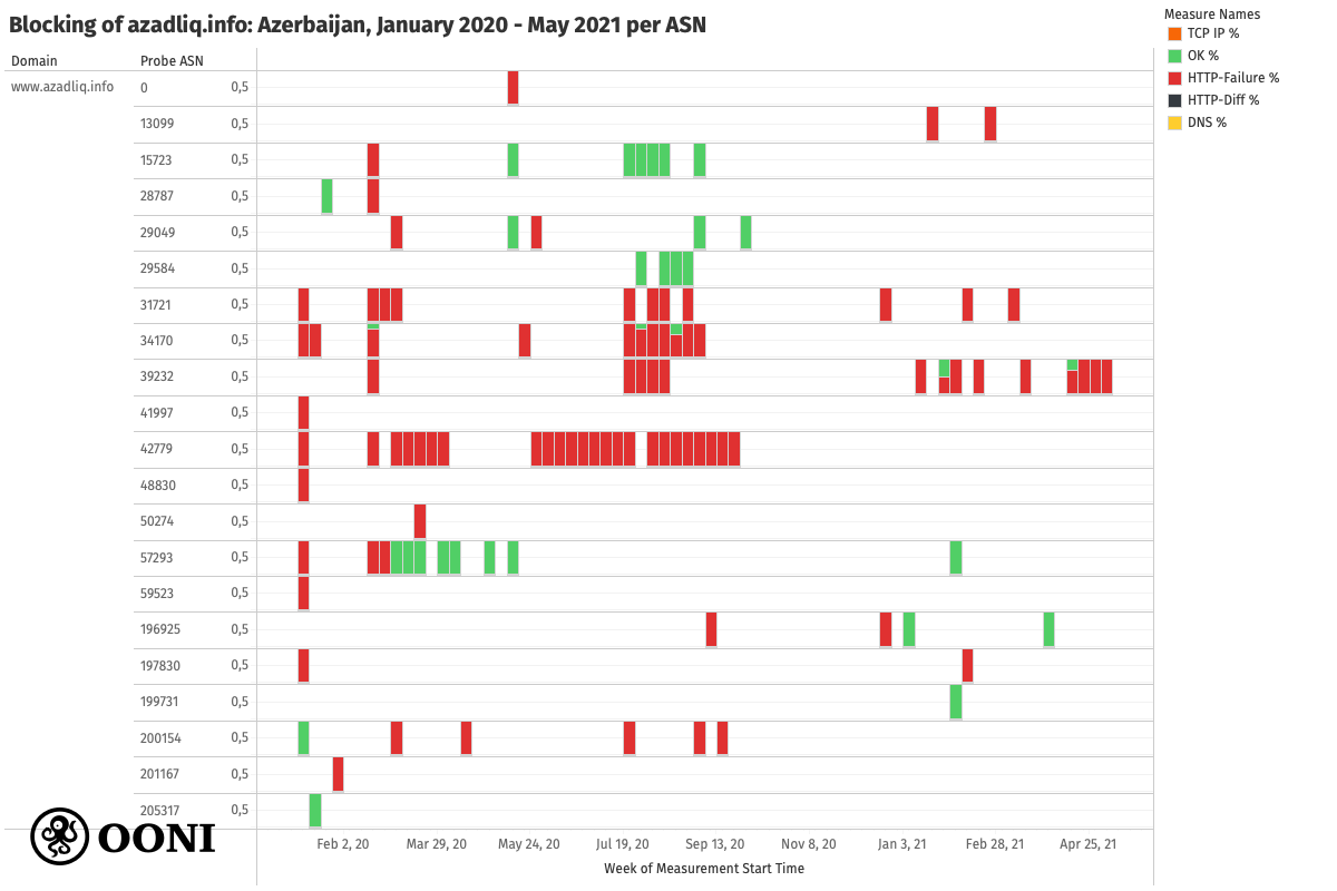 Press freedom appears to be quite limited in Azerbaijan, as suggested by the blocking of several independent news media websites in the country. These media websites presented signs of blocking throughout their testing (on several local AS networks) between January 2020 to May 2021 (corroborating past reports on the blocking of media websites in Azerbaijan), with recent OONI measurements suggesting that their blocking remains ongoing.