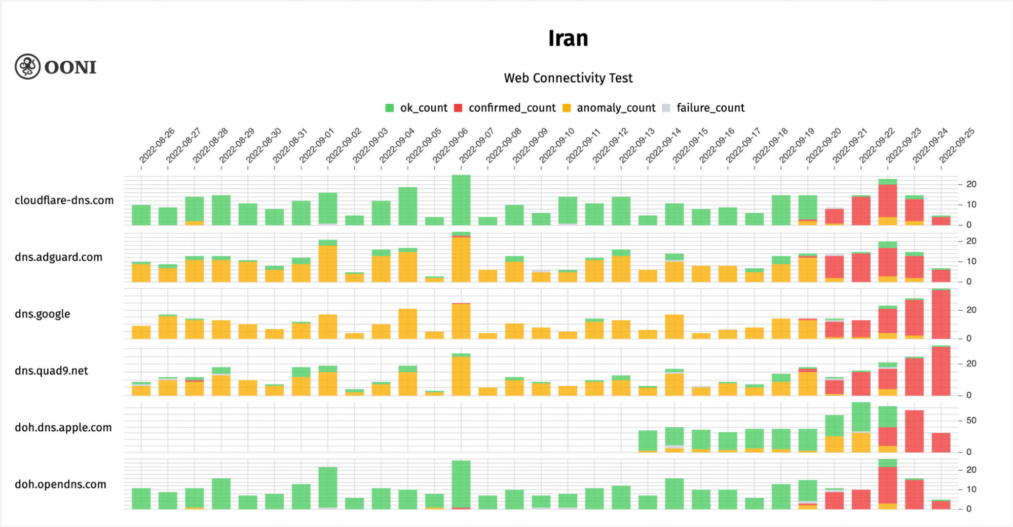 From the above chart (which aggregates OONI measurement coverage from the testing of popular DoH endpoints in Iran), we can see that as of 20th September 2022: