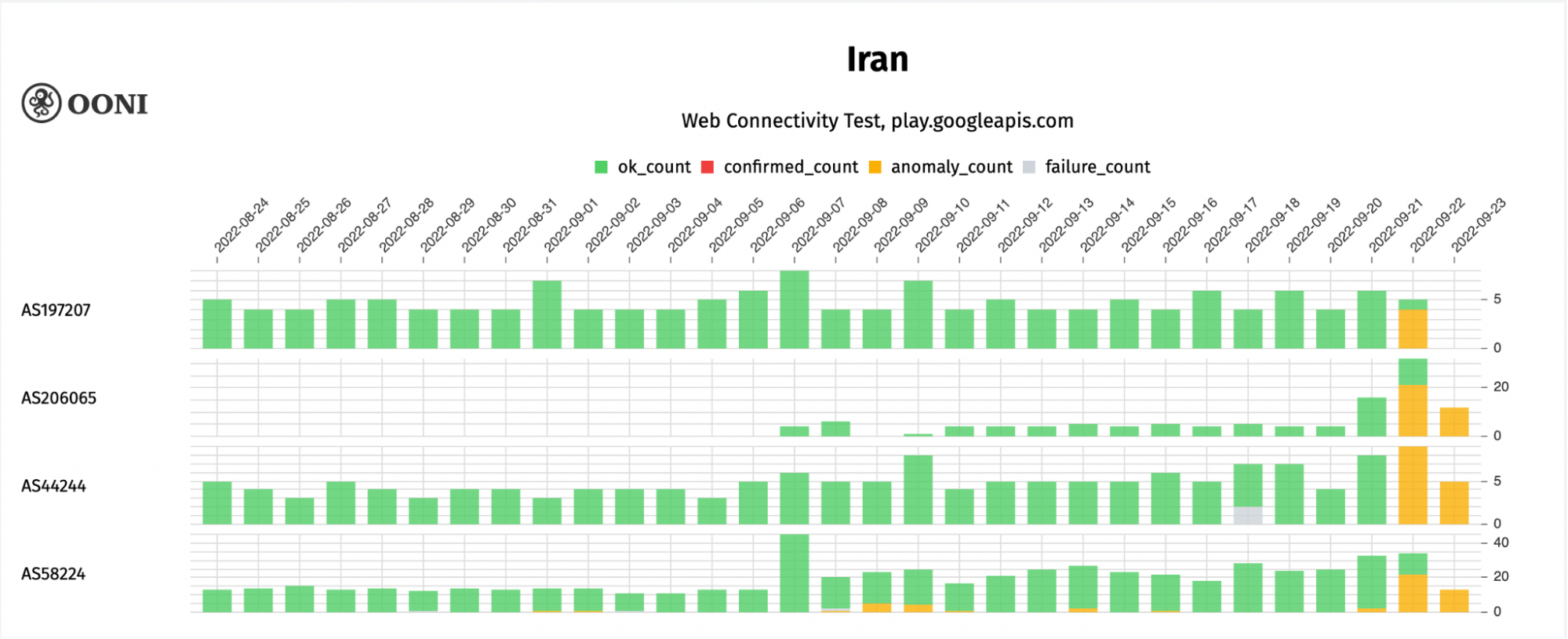 Through the following chart, we explore the blocking of play.googleapis.com on the following ASNs: AS197207 (MCI), AS206065 (Zi-Tel), AS44244 (Irancell), AS58224 (TCI). On all 4 networks, we observe a surge in anomalous measurements on 22nd September 2022.