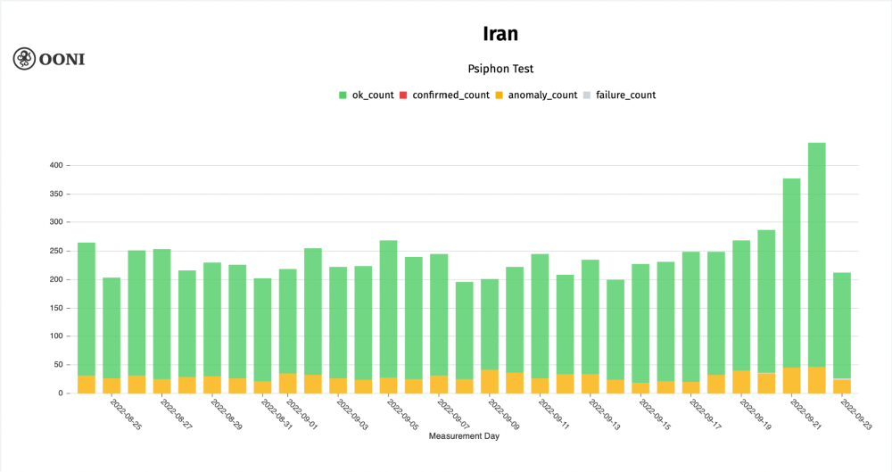 Chart: OONI data on the testing of Psiphon in Iran between August 2022 to September 2022 (source: OONI MAT).