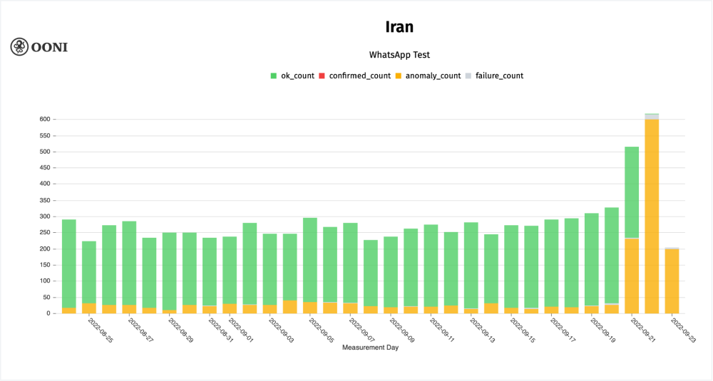 Chart: OONI data on the testing of WhatsApp on multiple networks in Iran between August 2022 to September 2022 (source: OONI MAT).