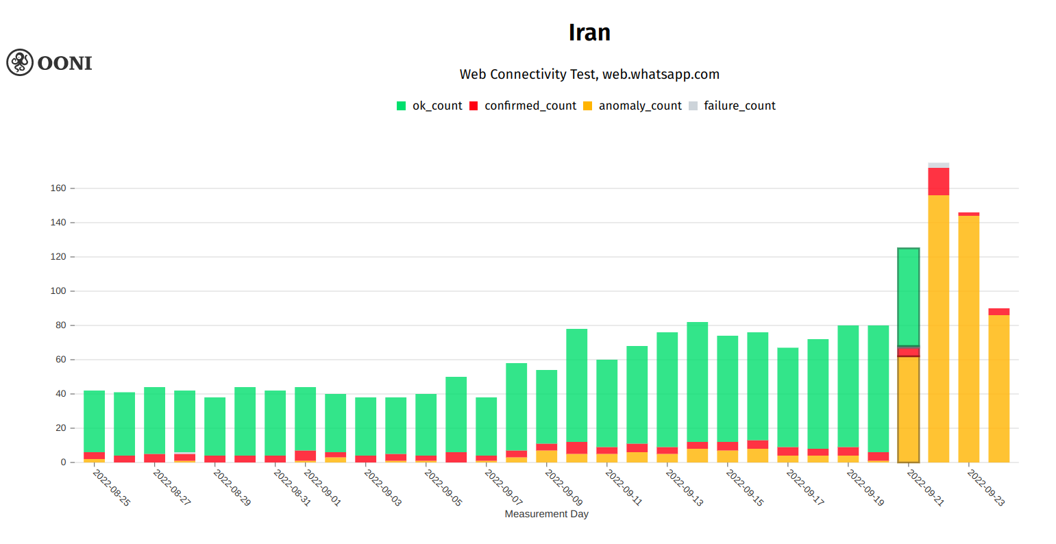 As part of this study, we looked at measurements collected from OONI’s Web Connectivity and WhatsApp tests in Iran over the past week (from 16th September 2022 onwards). While OONI Probe includes a variety of different network measurement experiments, we narrowed our focus to these two specific tests because they measure the accessibility of services that were reportedly blocked in recent days (other apps, like Signal and Facebook Messenger, had already been blocked over the past year).
