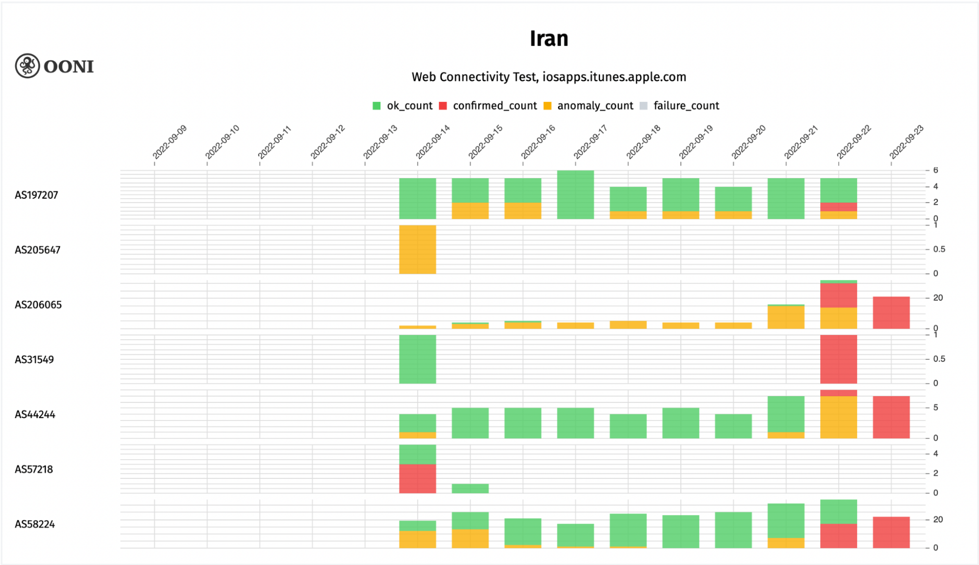 Chart: OONI data on the blocking of iosapps.itunes.apple.com by ASN in Iran in September 2022 (source: OONI MAT).