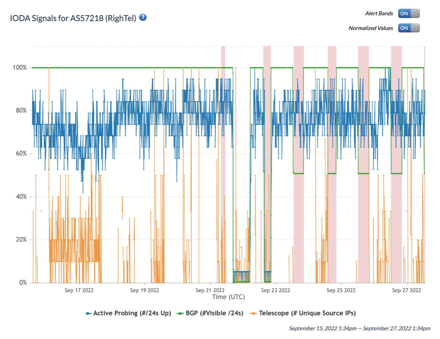Chart: Internet Outage Detection and Analysis (IODA) signals for RighTel (AS57218) between 16th September 2022 to 27th September 2022 (source: IODA).