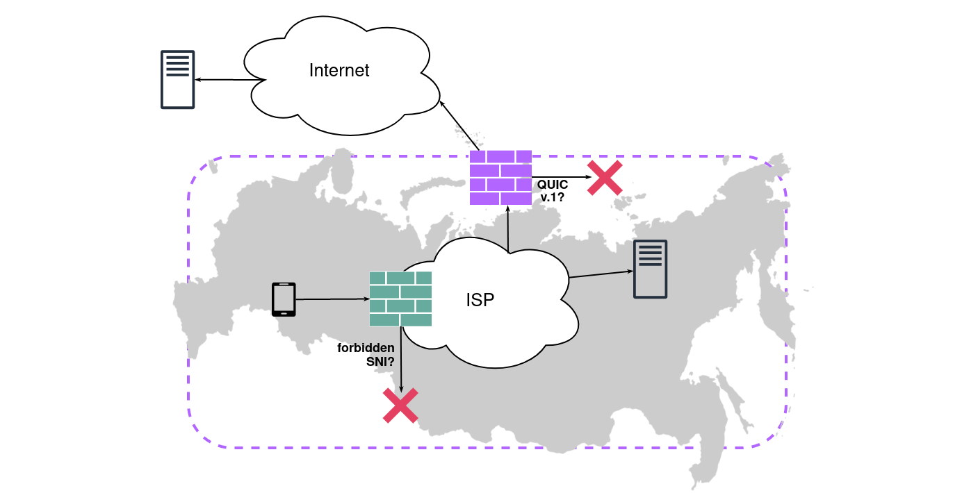 Depiction of a potential setup of HTTP/3 censorship in Russia. While the location and order of filters is unknown, this structure is in line with the observed measurements in AS31213 and user reports from other networks.More info on HTTP/3 censorship in Russia.