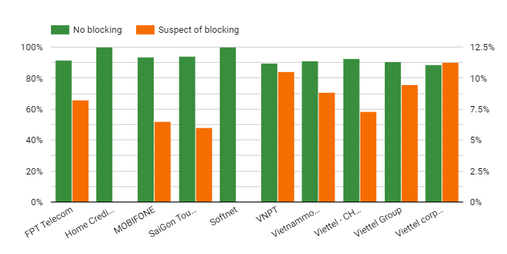 Figure: Percentage of no blocking and suspect of blocking by internet providers during the testing period.