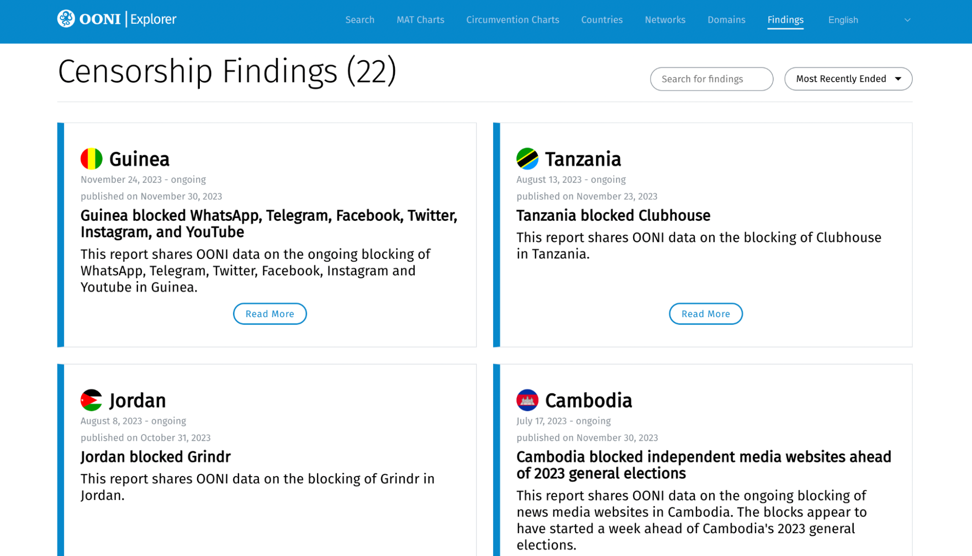 In response to emergent censorship events, the OONI Explorer Censorship Findings page will be updated with new reports on an ongoing basis.