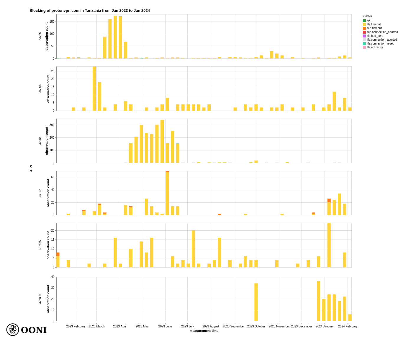Chart: Per ASN breakdown of OONI measurement coverage from the testing of ProtonVPN (protonvpn.com) in Tanzania between 1st January 2023 to 31st January 2024 (source: ooni/data tool).