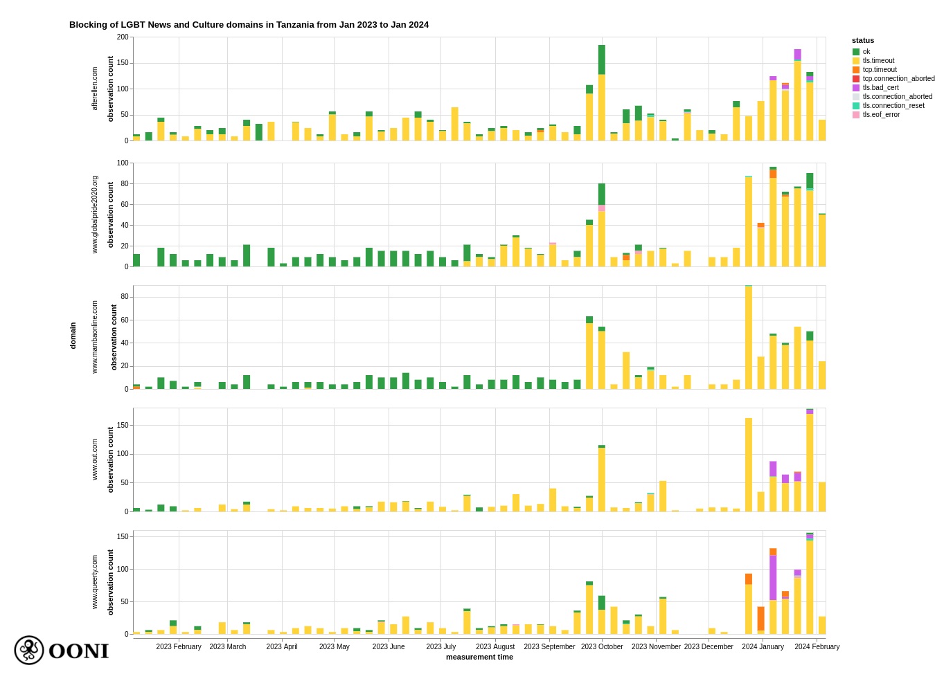 Chart: OONI Probe testing of afterellen.com, www.mambaonline.com, www.globalpride2020.org, www.out.com, www.queerty.com in Tanzania between 1st January 2023 to 31st January 2024 (source: OONI data).