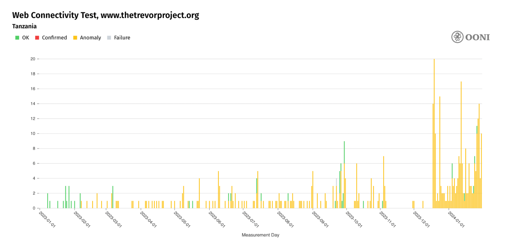 Chart: Blocking of The Trevor Project (www.thetrevorproject.org) in Tanzania between 1st January 2023 to 31st January 2024 (source: ooni/data tool).